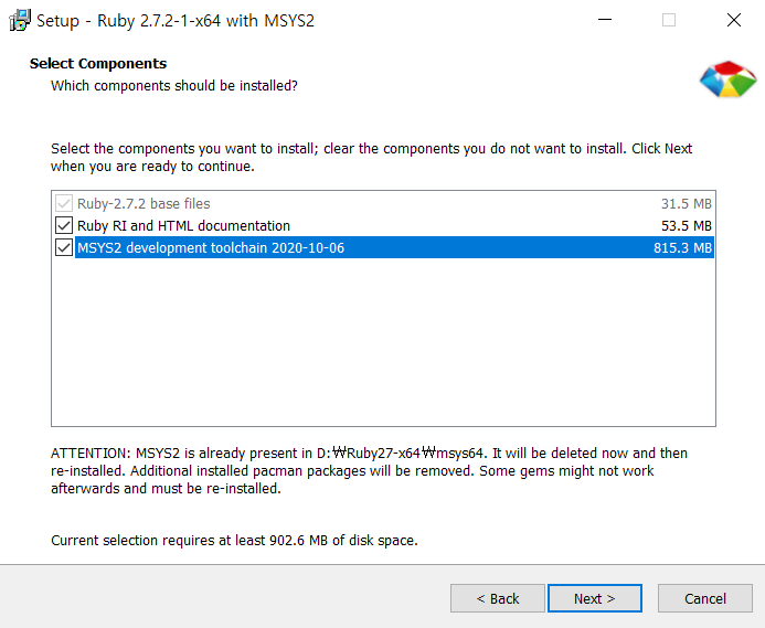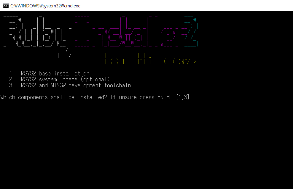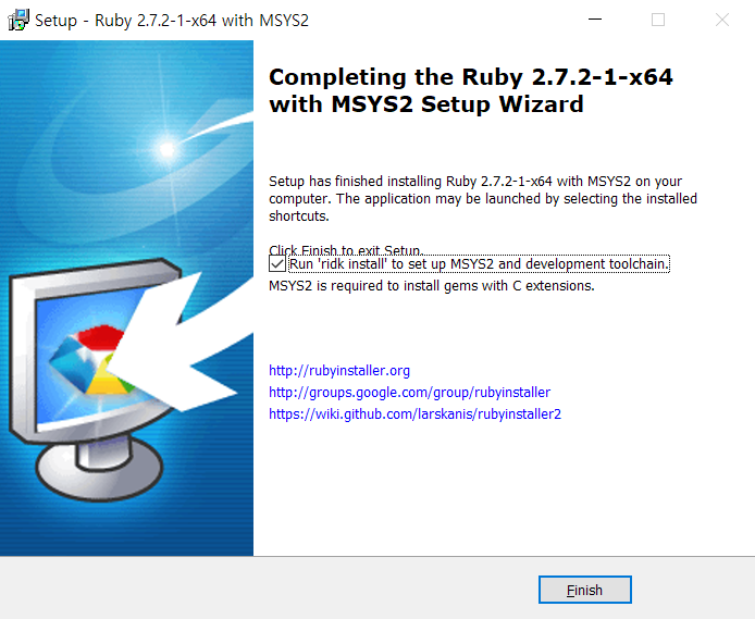 Ruby 설치가 끝나고 MSYS2 화면까지 왔으면 차례대로 1 -> 엔터 , 2 -> 엔터 , 3 -> 엔터를 누르면 설치 완료