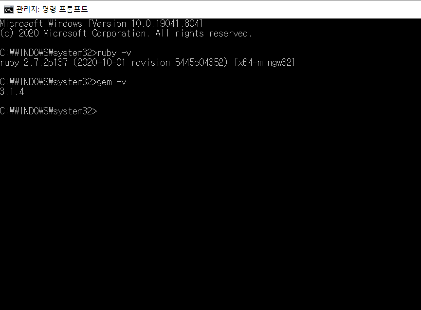 ruby -v,gem -v명령어로 잘 설치되었는지 확인